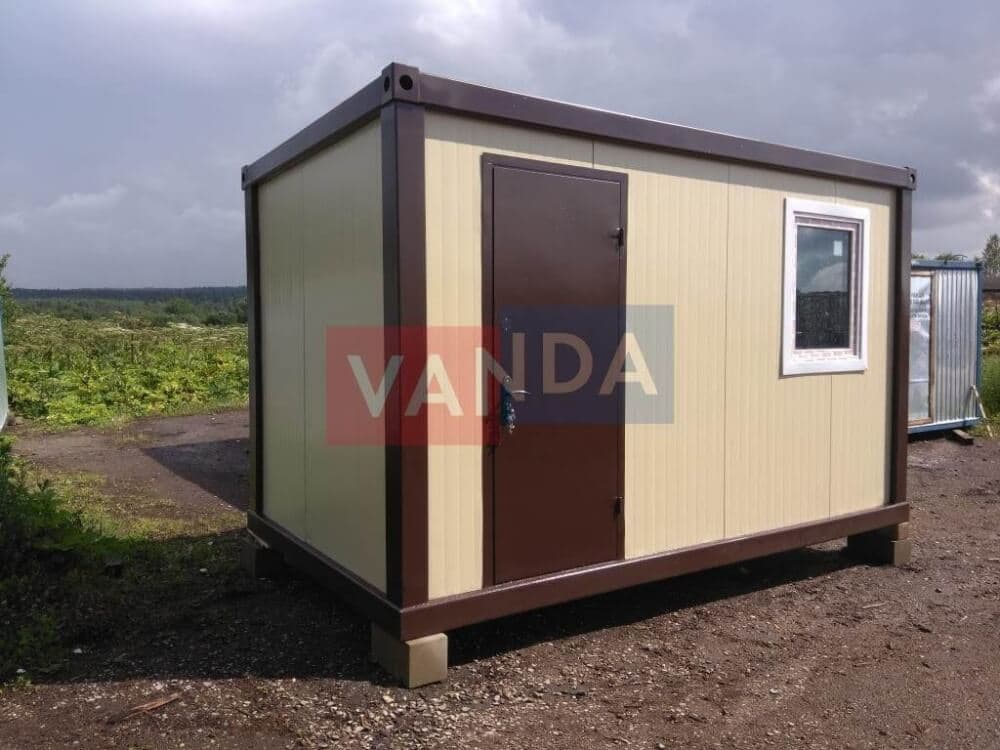 Контейнер состоит из металлического сварного основания. Стены изготовлены из сэндвич-панелей с прокладкой утеплителя. Крыша покрыта крашенным холоднокатаным металлом 1,2 мм. Помещение обустроено пароизоляцией при помощи технической пленки, которая проложена на полу и потолке. Внутренняя облицовка потолка выполнена из ПВХ-панелей, пол – из шпунтованной доски. Вход в помещение оборудован запирающейся металлической дверью.